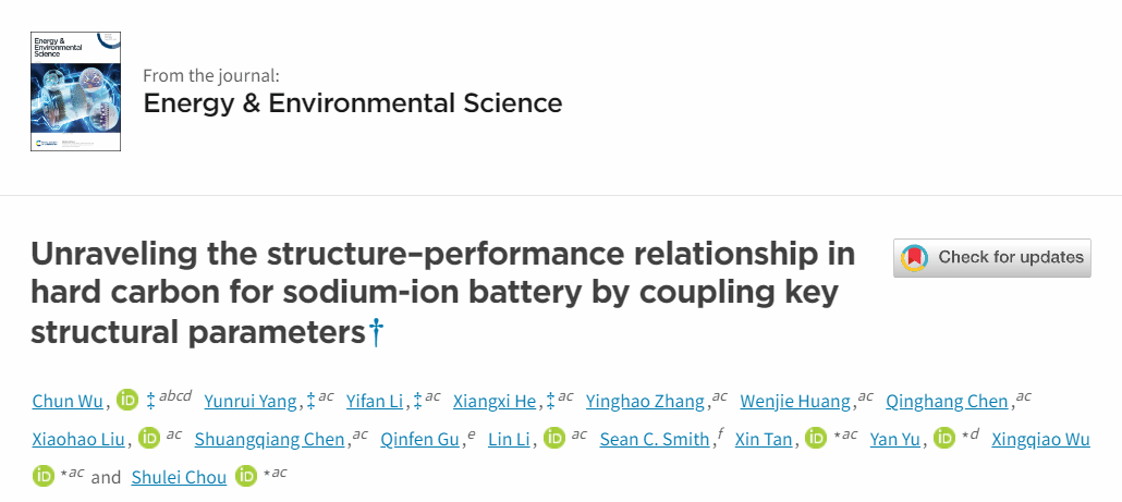 此项工作以Unraveling Structure-performance Relationship in Hard Carbon for Sodium-ion Battery by Coupling Key Structural Parameters为题发表在国际著名期刊Energy & Environmental Science上,温州大学作为第一单位,侴术雷教授,谭歆教授,余彦教授,吴星樵老师为通讯作者。该研究工作由博士后吴春、2024届硕士毕业生杨云锐、2023级硕士研究生黎一凡、上海大学/温州大学联培博士何祥喜完成。研究工作得到了国家自然科学基金,中国高端外国专家招聘计划,国家重点浙江省自然科学基金中国研发计划项目,安徽省科技计划项目,重点浙江省研发计划项目,温州自然科学基金等资助。