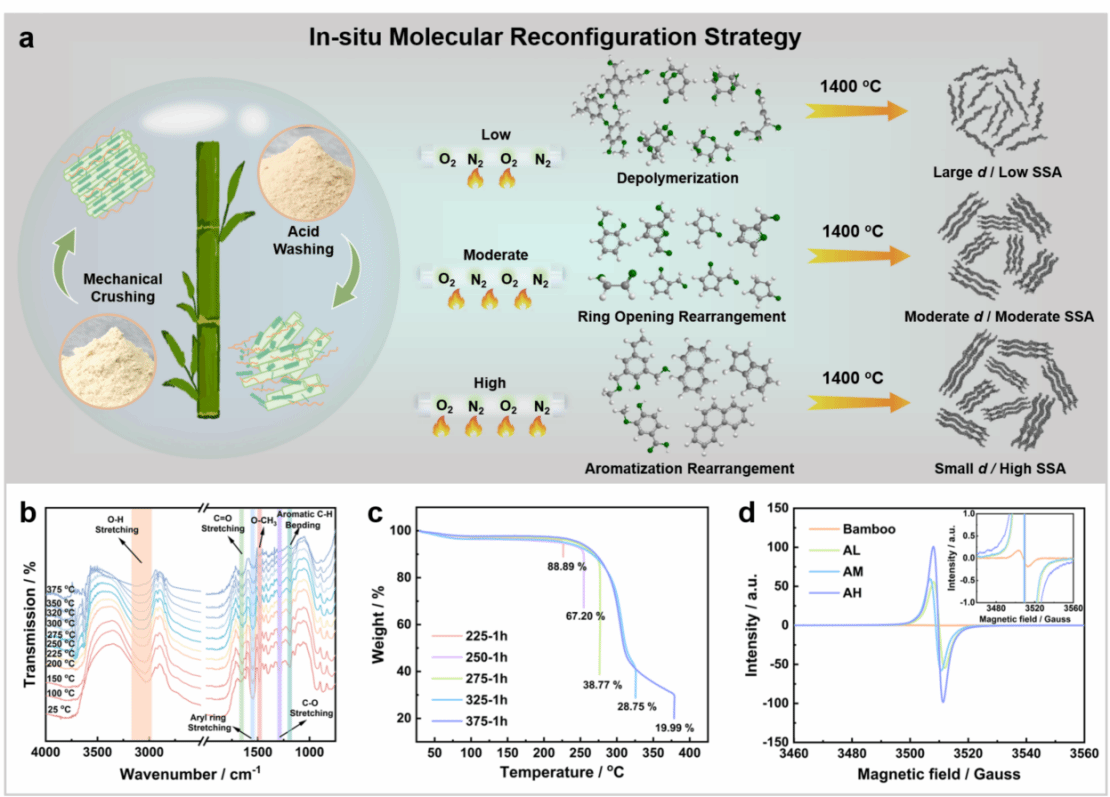 侴术雷、吴星樵、谭歆团队联合中国科学技术大学余彦教授等人,通过理论计算与实验结合,首次提出硬碳储钠的“层间距-曲率-缺陷”协同作用机制和耦合关键结构描述符设计高质量插层钠电负极材料的新理念:通过理论计算进行前瞻性设计,结合热力学驱动原位分子优化策略实现硬碳结构的定向制备,验证了酯类储钠性能趋势与理论预测的一致性,并成功实现了规模化放大。