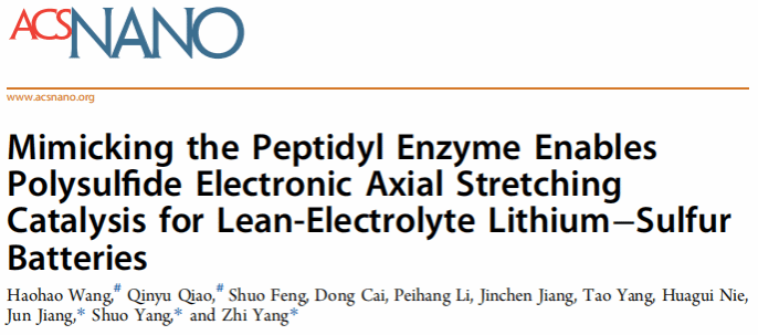 该工作以“Mimicking the Peptidyl Enzyme Enables Polysulfide Electronic Axial Stretching Catalysis for Lean-Electrolyte Lithium-Sulfur Batteries”为题发表于国际顶级期刊《ACS Nano》(IF=16.0)。温州大学作为第一通讯单位,我校电气与电子工程金沙官网