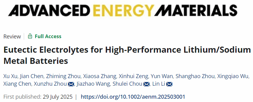 侴术雷教授、李林特聘教授课题组在国际权威期刊Advanced Energy Materials发表题为“Eutectic Electrolytes for High-Performance Lithium/Sodium Metal Batteries”的综述文章。该综述聚焦近年来在共晶电解液领域的研究进展,系统梳理了其在锂/钠金属电池中的应用潜力与关键挑战。本文从共晶电解液的形成机制出发,详细探讨其物理化学特性并系统总结了其在提升循环稳定性、快充能力、高电压兼容性与温度适应性等方面的进展,并展望了未来的研究方向。该综述为高性能锂/钠金属电池电解液系统的分子设计与界面调控提供了重要参考。金沙官网相关的文章发表在Advanced Energy Materials上,温州大学为第一通讯单位,第一作者是金沙官网
