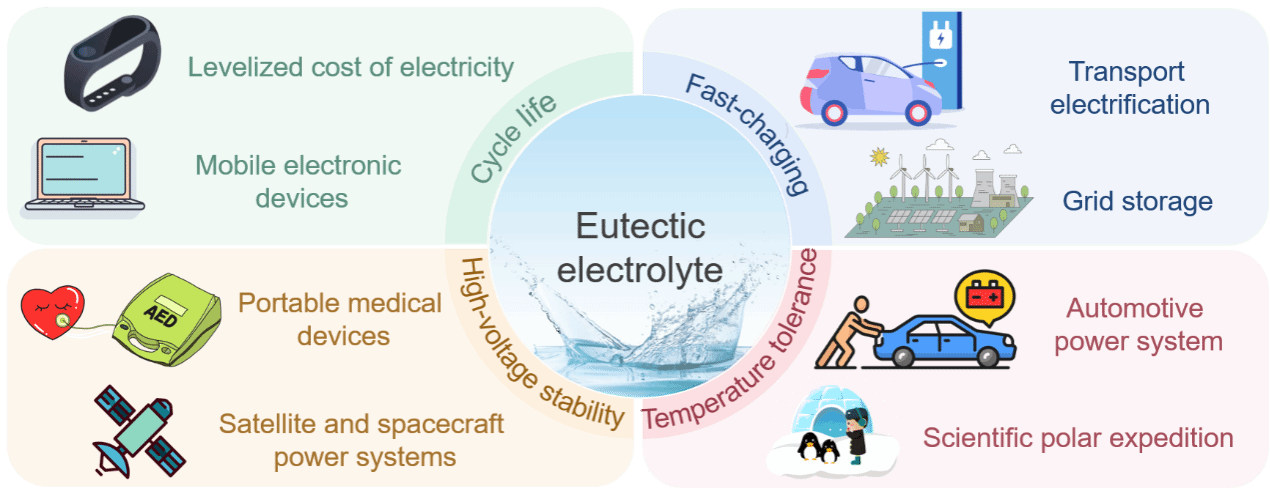 锂/钠金属负极虽具备极高的理论容量和较低的还原电位,但仍面临枝晶生长、容量衰减与安全性差等挑战。与传统电解液相比,共晶电解液具备高离子迁移数、宽电化学窗口、良好的热稳定性及可调控的分子间作用力等优势,在提升循环寿命、快充能力、高电压稳定性和温度适应性等方面展现出的巨大优势。