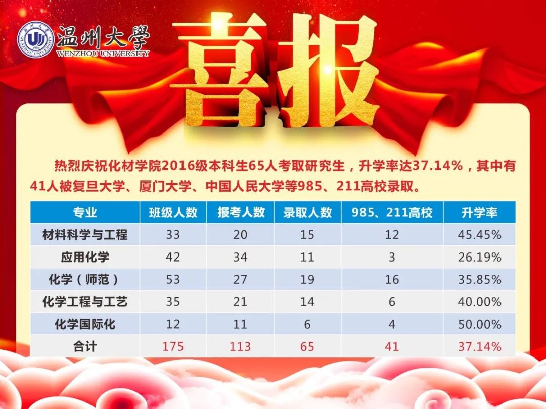 2020届毕业生共175人,113人报考研究生考试,72人过国家复试线,过线人数达到报考人数的63.71%;其中65人成功被录取,录取人数达到报考人数的57.52%,升学人数占全体本科毕业生数的37.14%;有41人被复旦大学、厦门大学、中国人民大学等985、211高校录取,考研录取率和考取名校人数创历史新高,这一切离不开金沙官网
