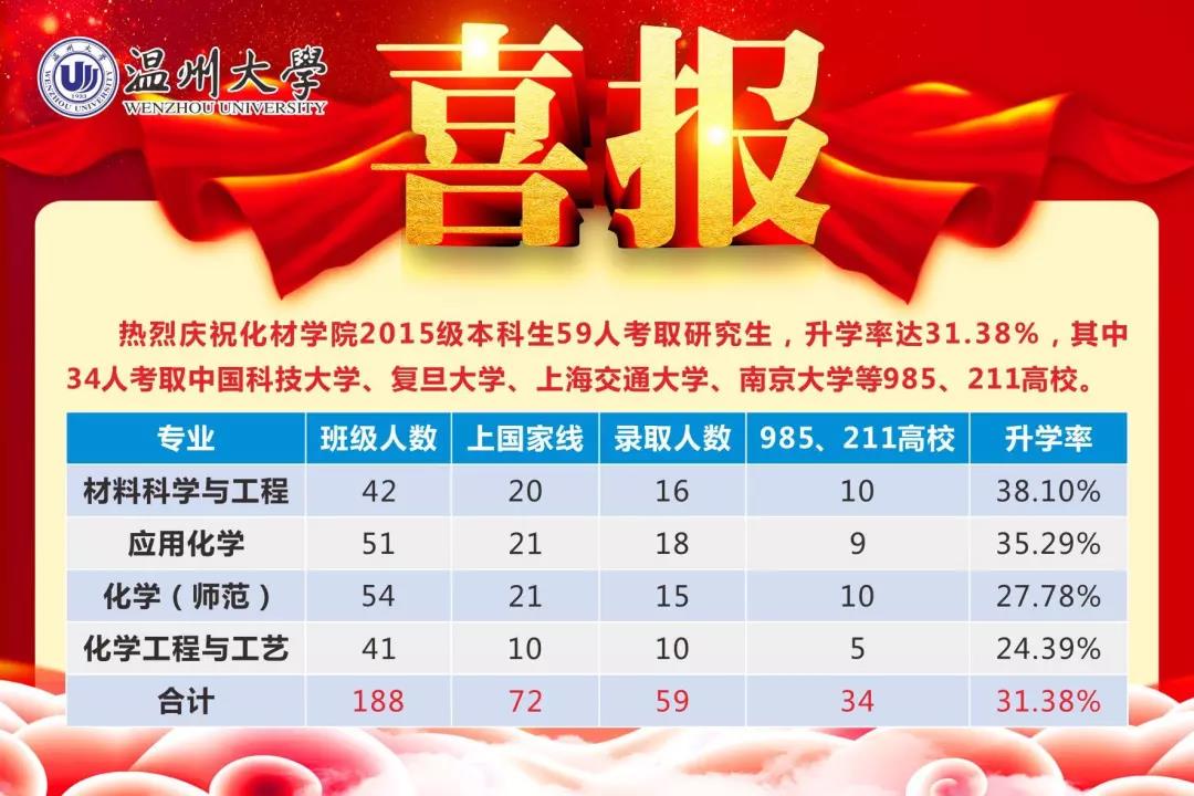 2019届毕业生共188人,90人报考研究生考试,71人过国家复试线,过线人数达到报考人数的78.9%;其中59人成功被录取,录取人数达到报考人数的65.6%,升学人数占全体本科毕业生数的31.4%;有34人被中科院、复旦大学、南京大学、上海交通大学等985、211高校录取,考研录取率和考取名校人数创历史新高。