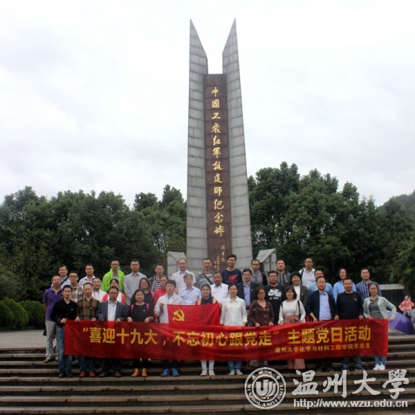 纪念碑前,张立学老师详细介绍了温州市浙南(平阳)抗日根据地的历史背景,讲解了策应红军长征的中国工农红军北上抗日先遣队(即寻淮洲、方志敏率领的红七军团、红十军团)突围部队组建的挺进师,在刘英、粟裕同志的率领下,于1935年进入浙江南部后,与闽东特委叶飞等人会合,又与浙南地下党和红军游击队会师,开辟与建立的主要抗日根据地的史实。全体党员同志备受感动,在中国工农红军挺进师纪念碑合影留念。