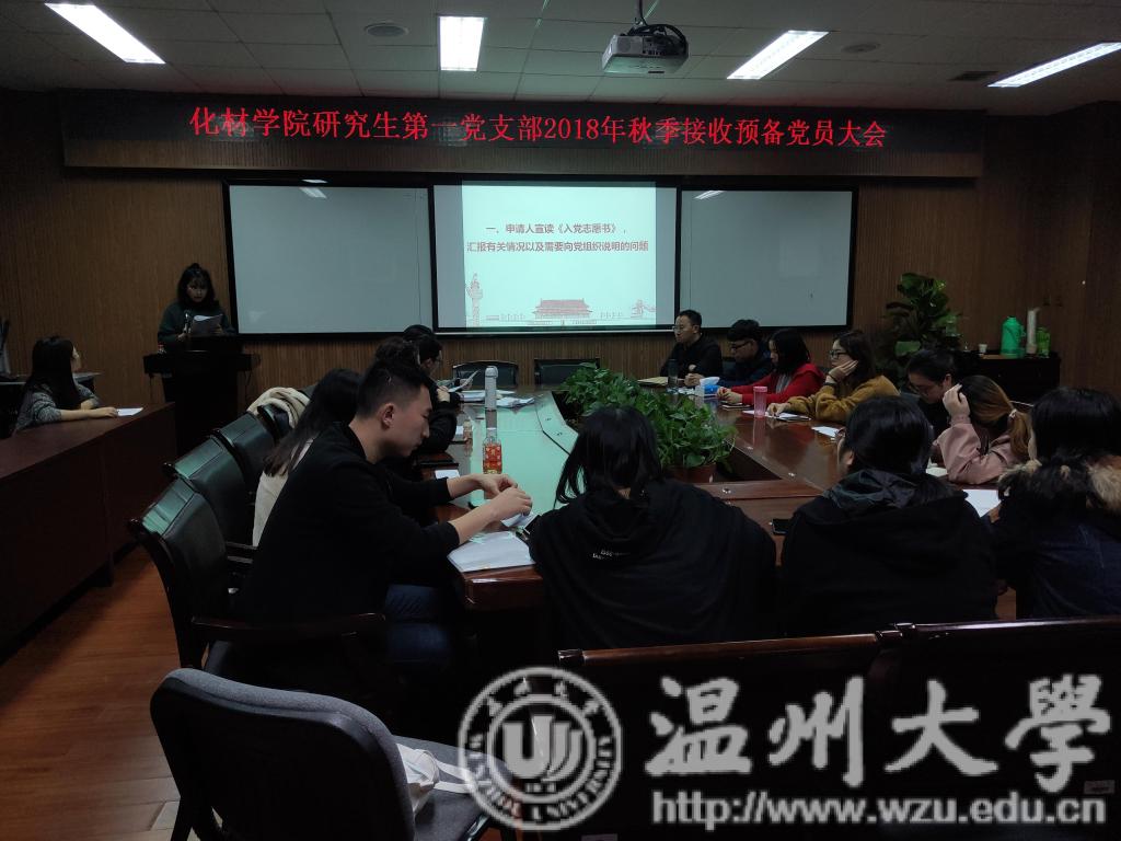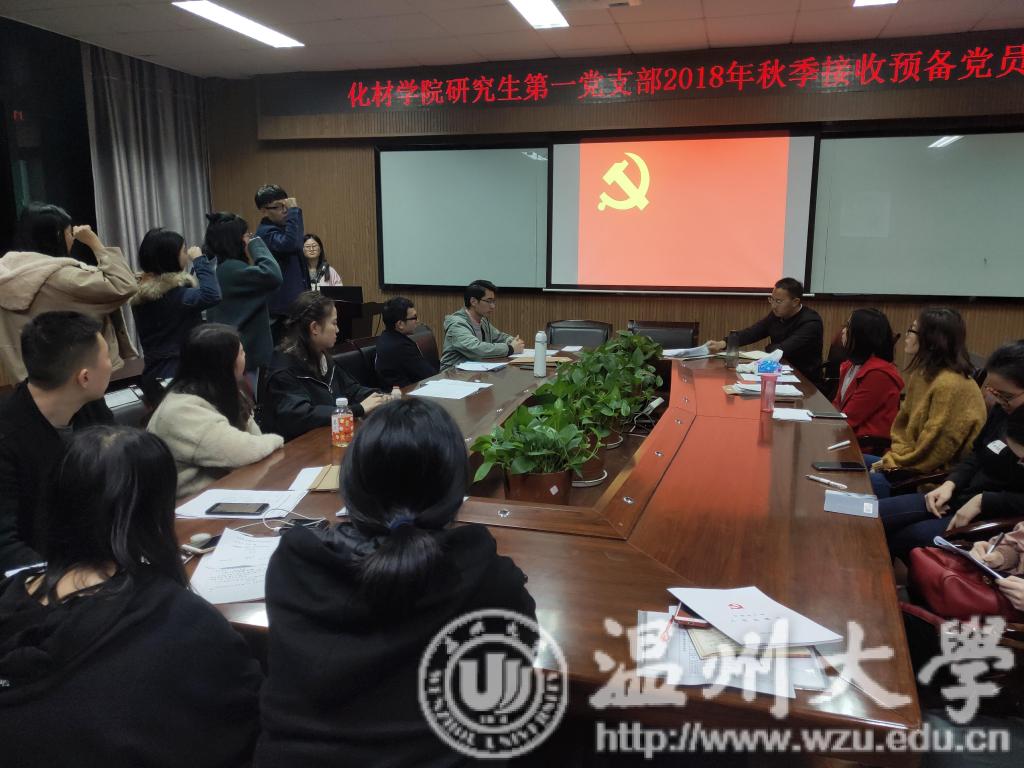 研究生第一党支部于化材楼11B204召开党员发展大会。与会的主要人员有支部指导老师邹涌彬、11名正式党员与2名预备党员,会议由支部书记祝精燕同志主持。