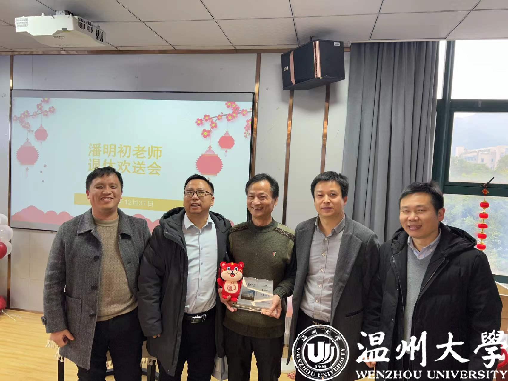 最后,杨植副院长为潘明初老师送上鲜花、纪念品,并祝愿他退休后身体健康、青春永驻、生活幸福。