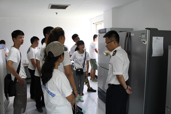 首先,队员们分成了两大组,分别由各自的带队队长带领分不同的时间段参观出入境检验检疫局。初到入境检验检疫局后,由韩超老师带领队员们在入境检验检疫局8楼参观其中的一些检验仪器。并由韩超老师给队员们介绍了仪器的具体使用情况,和一些企业内部检验的步骤与检验的离子等。